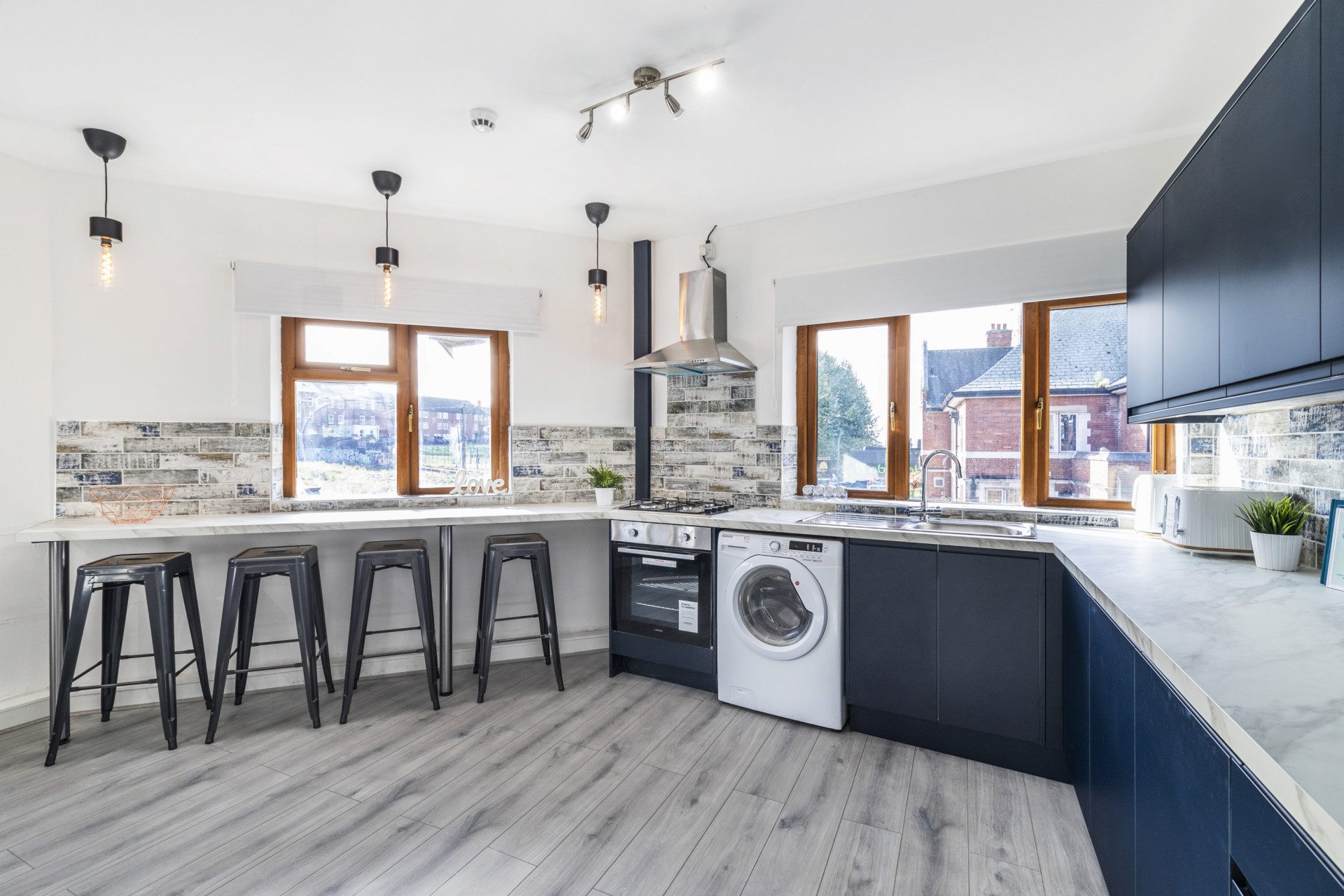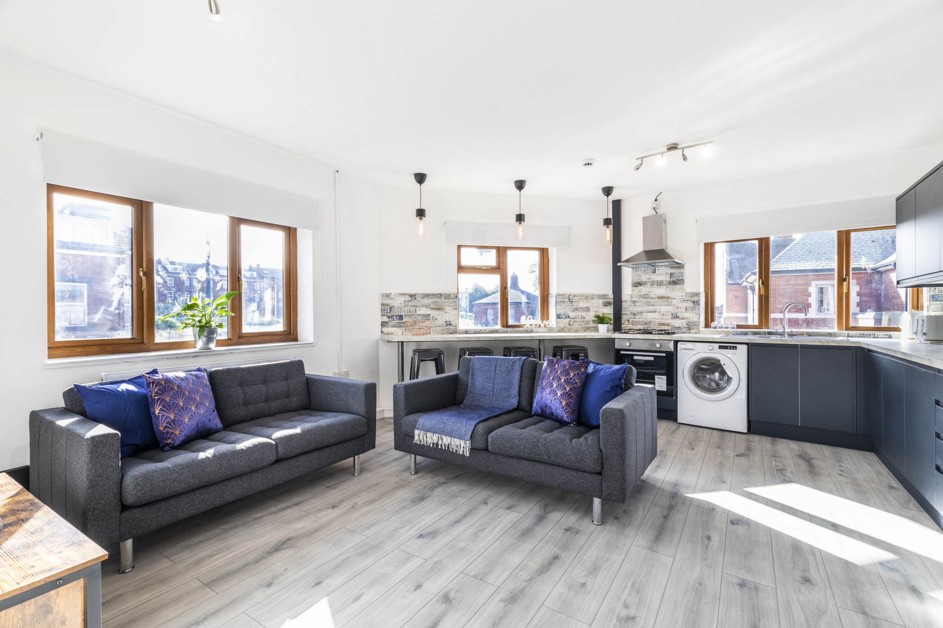 Open plan kitchen, fully kitted out with all the necessary appliances.