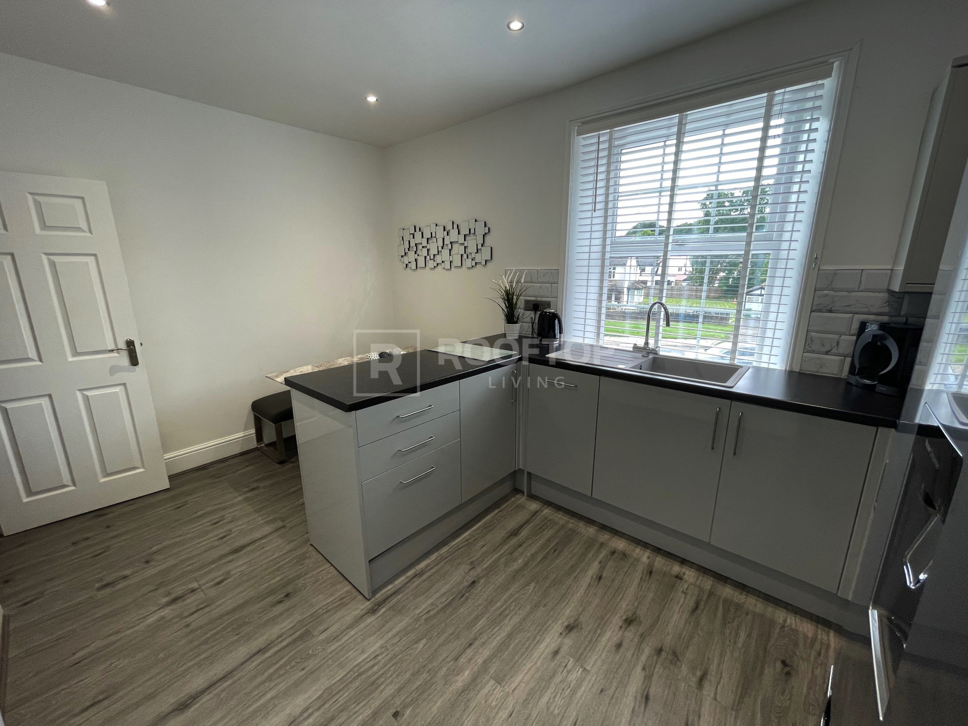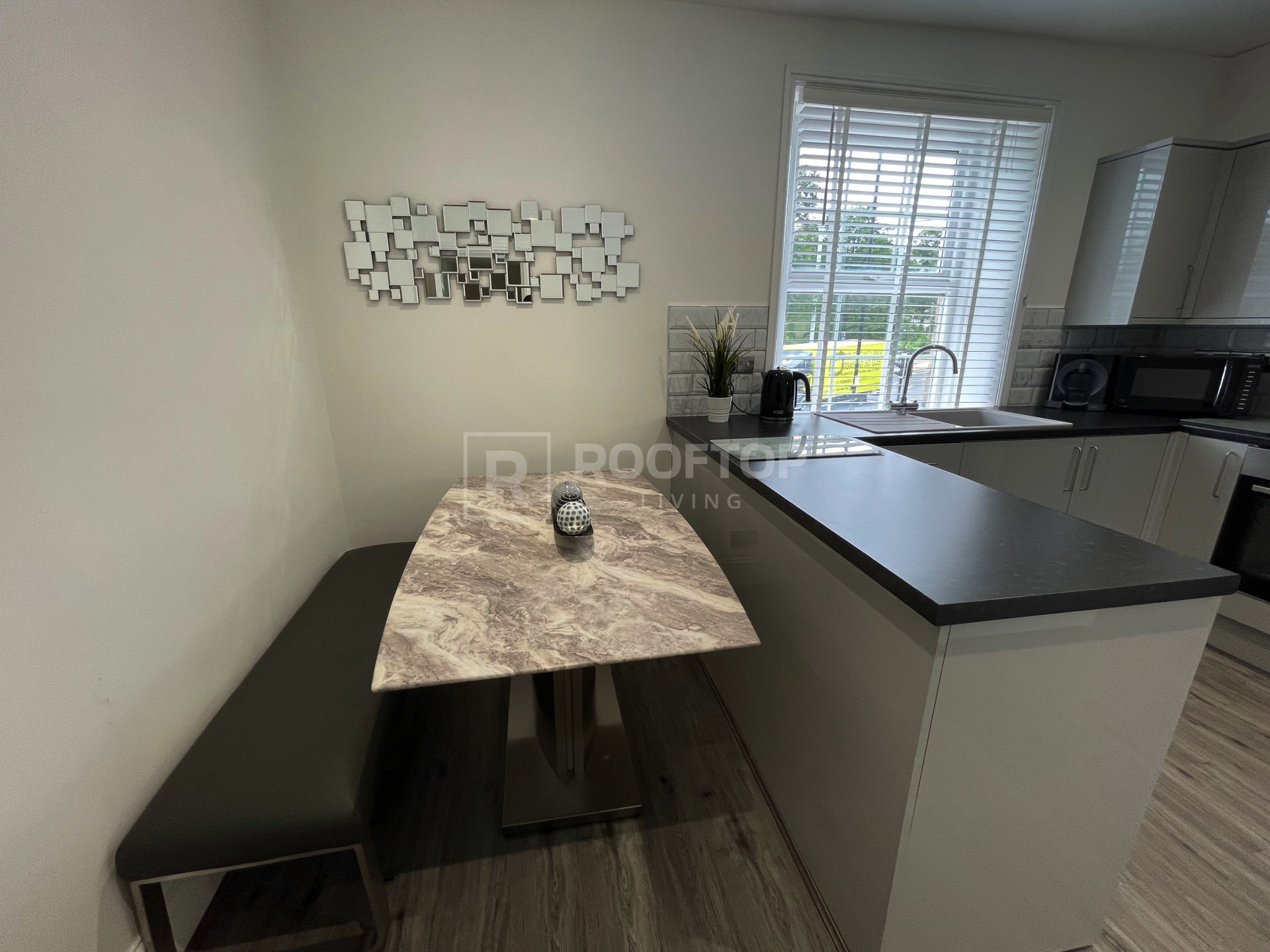 Designer kitchen with dining area, fully kitted out with all the necessary appliances - Dishwasher, kettle, toaster, microwave, washing machine.