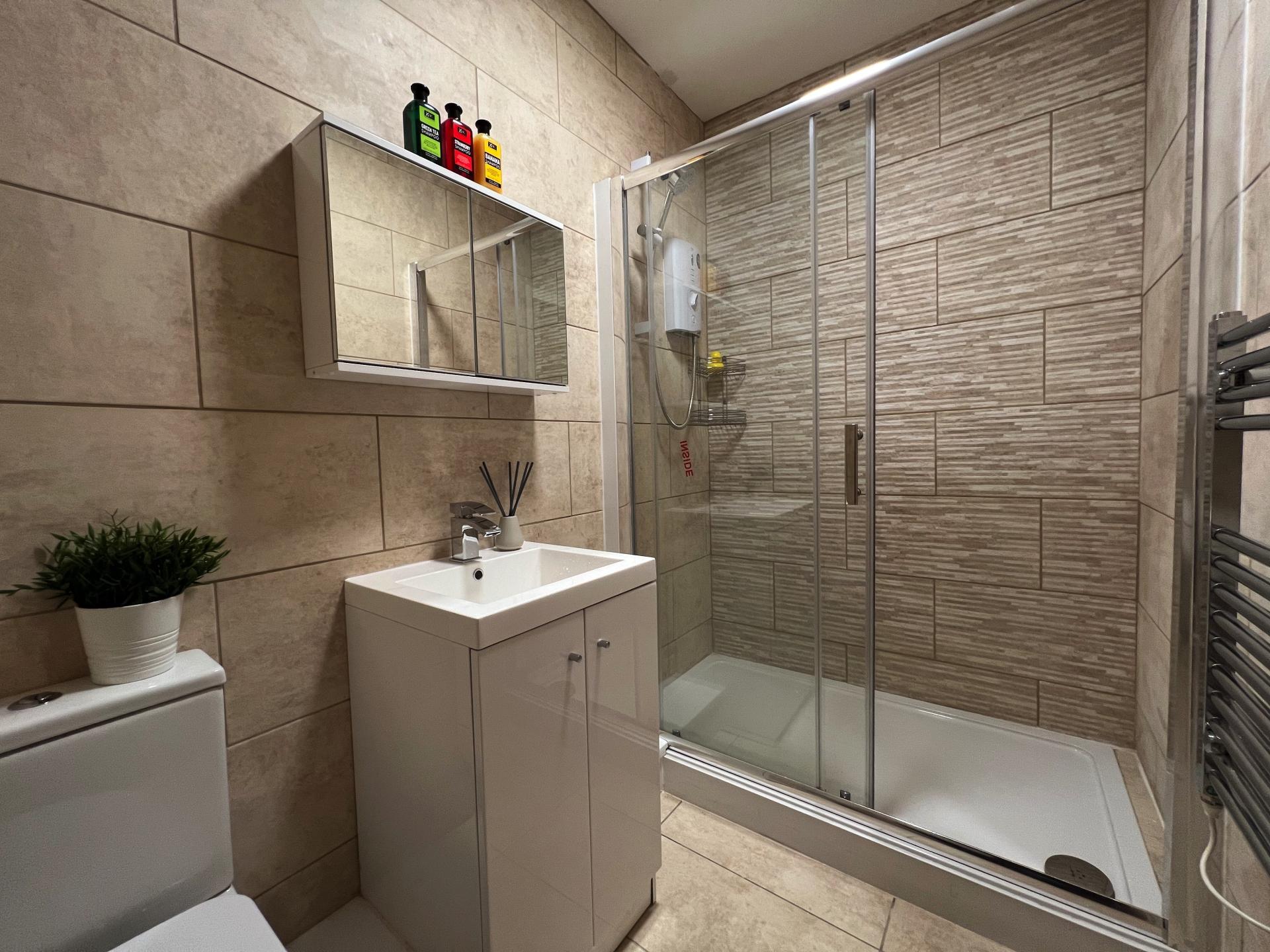 1 large fully tiled modern bathroom.